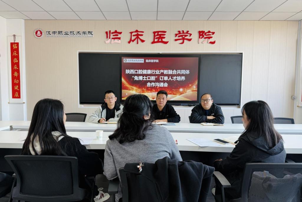 2025年11月20日,汉中职业技术学院临床医学院与西安兔博士口腔在2号楼514会议室召开陕西口腔健康行业产教融合共同体“兔博士口腔”订单人才培养合作沟通会议。兔博士口腔集团人力资源总监张亚非、招聘主管李晴、汉中分院人力主管钟菲和临床医学院党政领导出席会议。