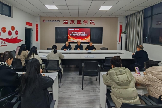2025年12月8日晚,临床医学院在2号教学楼514室组织召开第15周主题班会暨12月份学生工作安排部署会。学院党委委员、副院长张仕锋,临床医学院党政领导、学管办和全体辅导员、班主任参加会议,会议由临床医学院党总支书记周建军主持。